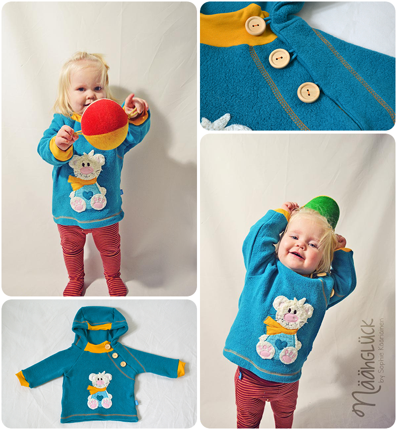 Hier ist aus kuscheligem Baumwollfleece ein neuer Pulli entstanden. Als Grundlage für den Schnitt war das Pilvi – Shirt. Aber ich hab so einges dran geändert – also weiter gemacht, eine überlappende Knopfleiste eingearbeitet und eine Kapuze (die ist etwas reichlich geworden, aber noch in Ordnung) drangenäht.