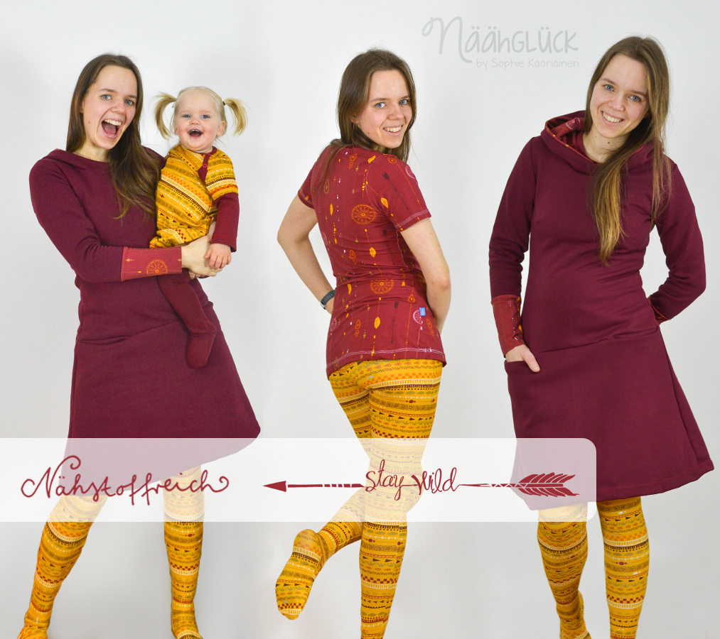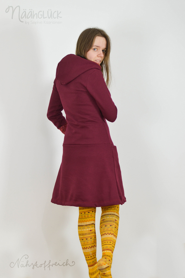 Ich musste mir unbedingt noch ein Kleid Aito nähen, da ich bei meinen anderen Kleidern permanent versuche meine Sachen in die nicht vorhandenen Taschen zu stopfen. Und in die Taschen passt einfach irgendwie alles. Zusätzlich habe ich noch eine Kapuze dran gebastelt, so kommt auch noch einmal der tolle Stoff mit den innen zur Geltung.