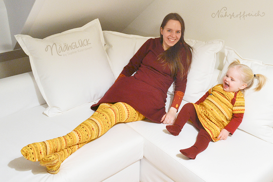 Für meine Kleine entstand dann noch ein Kleidchen mit Knopf leiste und eine Strumpfhose für den passenden Partner-Look. Auch ein passendes T-Shirt ist noch aus der Kollektion entstanden. Jetzt habe ich wirklich alle Stoffe bis auf den letzten Fitzel vernäht.