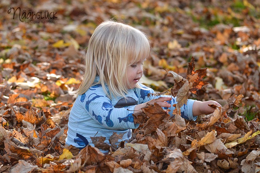 Fotografiert haben wir im kleinen aber feinen Tierpark in Ulm und auf dem Weg zur Straßenbahnhaltestelle gab es super Laubhaufen zum Reinsetzen. Nachdem die Sachen ihre Tobetauglichkeit bewiesen haben hängen sie nun mit der Urlaubswäsche auf der Leine und werden sicher bald wieder gerne angezogen (Beim Großen gab es nämlich mächtig Protest, dass es in die Wäsche wanderte).