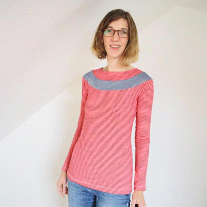 Das Shirt Runa wurde von isländischer Strickmode inspiriert. Die Rundpasse kann optional noch einmal unterteilt werden. Für den Ausschnitt steht die Option eines niedrigen Rollkragens oder eines einfachen Rundhalsausschnittes zur Verfügung. Eine Linie für eine Kurzarm-Variante ist ebenfalls enthalten.