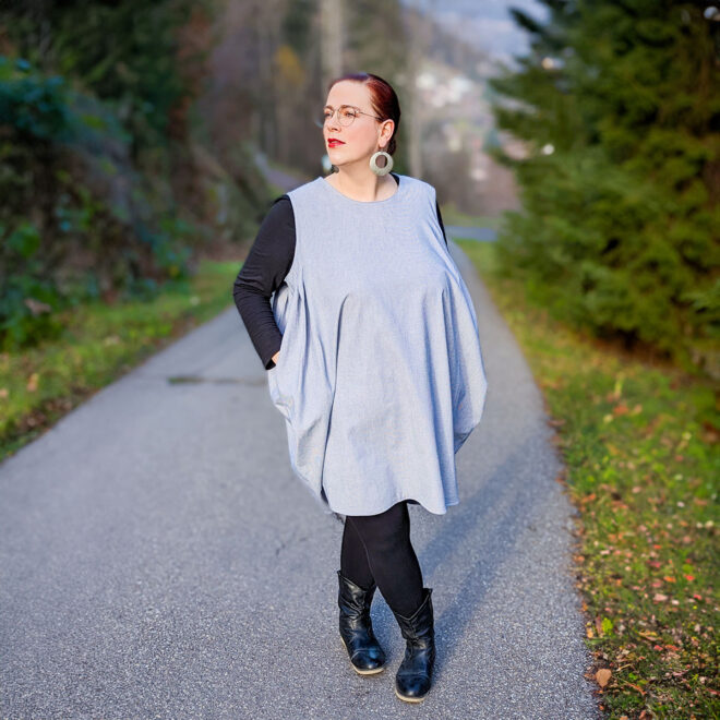 Tonttu ist ein bequemes weit geschnittenes Kleid mit charakteristischen Falten am Armausschnitt bis hin in die Seitennaht, in denen sich auch noch praktische Taschen verstecken.